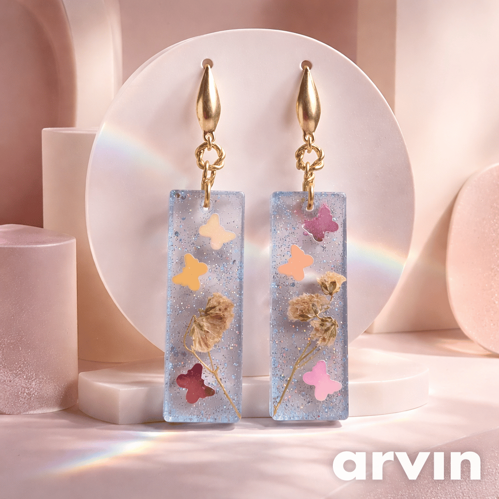 RESIN RECTANGLE EARRINGS WITH GLITTER AND DRIED FLOWERS WITH BUTTERFLIES