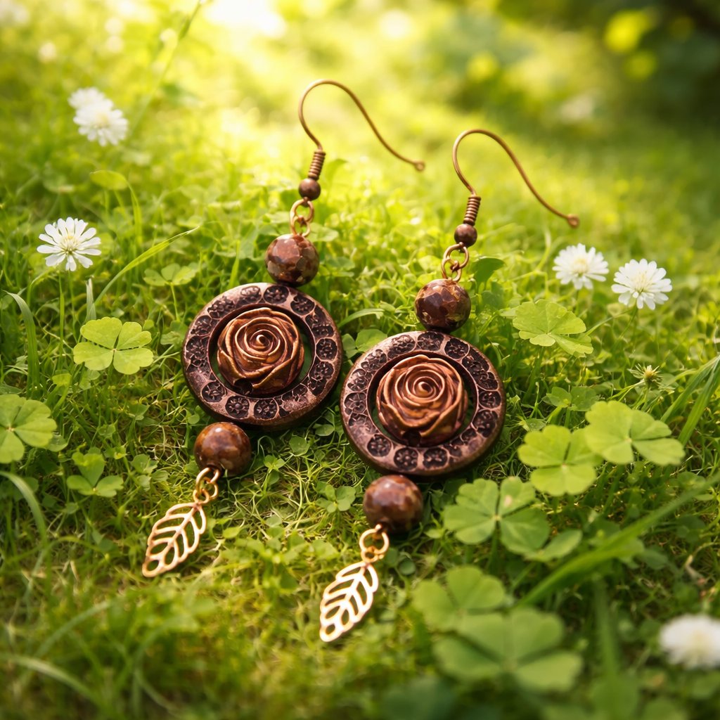 WOOD ROSE EARRING WITH GOLD LEAF DANGLE